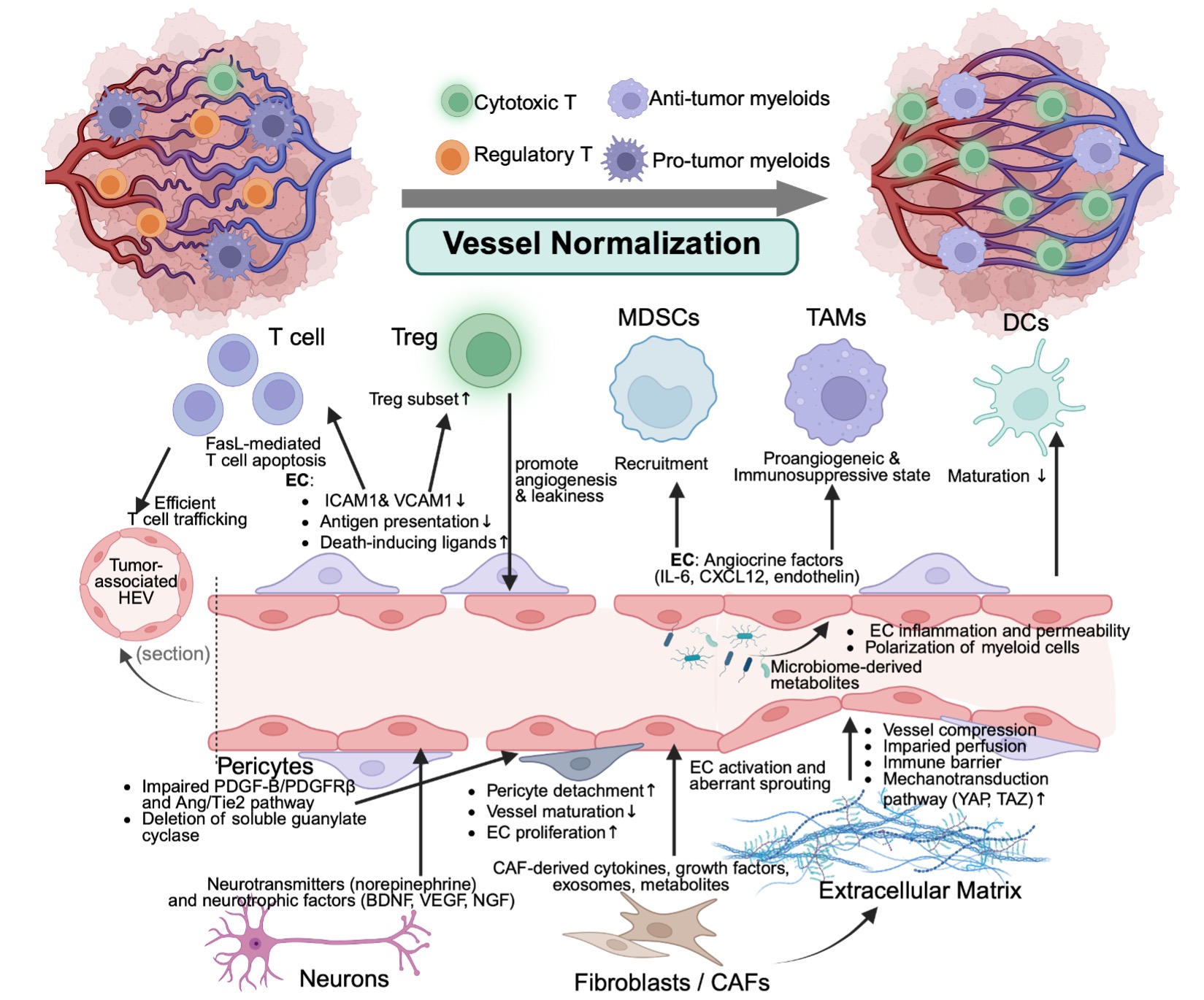 Over the past 25 years, anti-angiogenic therapies have moved from a simple "starve the tumor" strategy to a far more nuanced understanding of blood vessels as an active and reprogrammable component of tumors. Here, we elucidate this evolution by asking not just how tumors build abnormal blood vessels, but how those vessels shape the immune microenvironment, resist therapy, and can be strategically “normalized” to improve patient outcomes. We also wanted to capture an emerging frontier: how factors beyond classic growth factors, such as, the nervous system, gut microbiome, sex hormones, aging, and exercise, can also influence tumor vasculature in ways that could open entirely new therapeutic avenues.